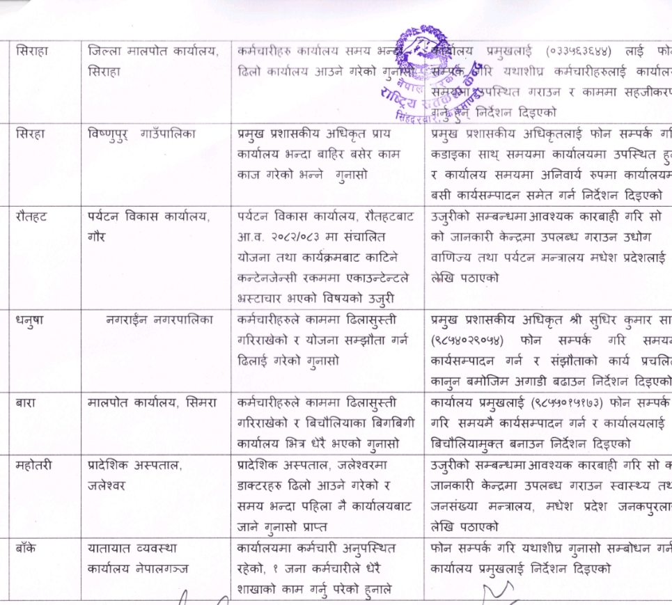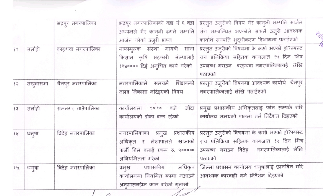 धनुषाको विदेह नगरपालिकाका प्रमुख प्रशासकीय अधिकृत शैलेन्द्र कुमार यादव त कार्यालयमै नआएर अनुशासनहीन काम गरेको गुनासो आएको छ। उक्त विषयमा छानबिन गर्न राष्ट्रिय सतर्कता केन्द्रले जिल्ला प्रशासन कार्यालय, धनुषालाई निर्देशन दिएको हो। विदेह नगरपालिकाका प्रमुख प्रशासकीय अधिकृत र लेखापालले ५ लाख रुपैयाँको खाजाको फर्जी बिल बनाइ अनियमितता गरेको आरोप लागेको छ। सर्लाहीको बरहथवा नगरपालिकाले नाफामूलक संस्था गायत्री साना किसान कृषि सहकारी संस्थालाई १९ लाख ४० हजार रुपैयाँ दिएर अनुचित कार्य गरेको समेत उजुरी/गुनासो आएको हो। गुनासो आउनेबित्तिकै राष्ट्रिय सतर्कता केन्द्रले जवाफ माग्न थालेको छ। फर्जी बिल बनाइ अनियमितता गरेको र नाफामूलक संस्था गायत्री साना किसान कृषि सहकारी संस्थालाई १९ लाख ४० हजार रुपैयाँ दिएर अनियमितता गरेको विषयमा अख्तियार दुरुपयोग अनुसन्धान आयोगले छानबिन गरेर भ्रष्टाचार मुद्दा चलाउने प्रकृतिको देखिन्छ।
