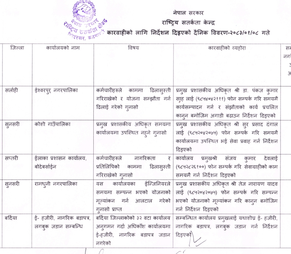 सिराहाको विष्णुपुर गाउँपालिकाका प्रमुख प्रशासकीय अधिकृत दुखि कापर कार्यालयभन्दा बाहिर बसेर कामकाज गर्ने गुनासो समेत आएको छ। राष्ट्रिय सतर्कता केन्द्रमा सर्लाहीको ईश्वरपुर नगरपालिकादेखि धनुषाको नगराइन र सुनसरी रामधुनी नगरपालिकासम्मका गुनासो आउने गरेको छ। उक्त विषयमा समेत रााष्ट्रि सतर्कता केन्द्रले एक्सन लिएको हो।