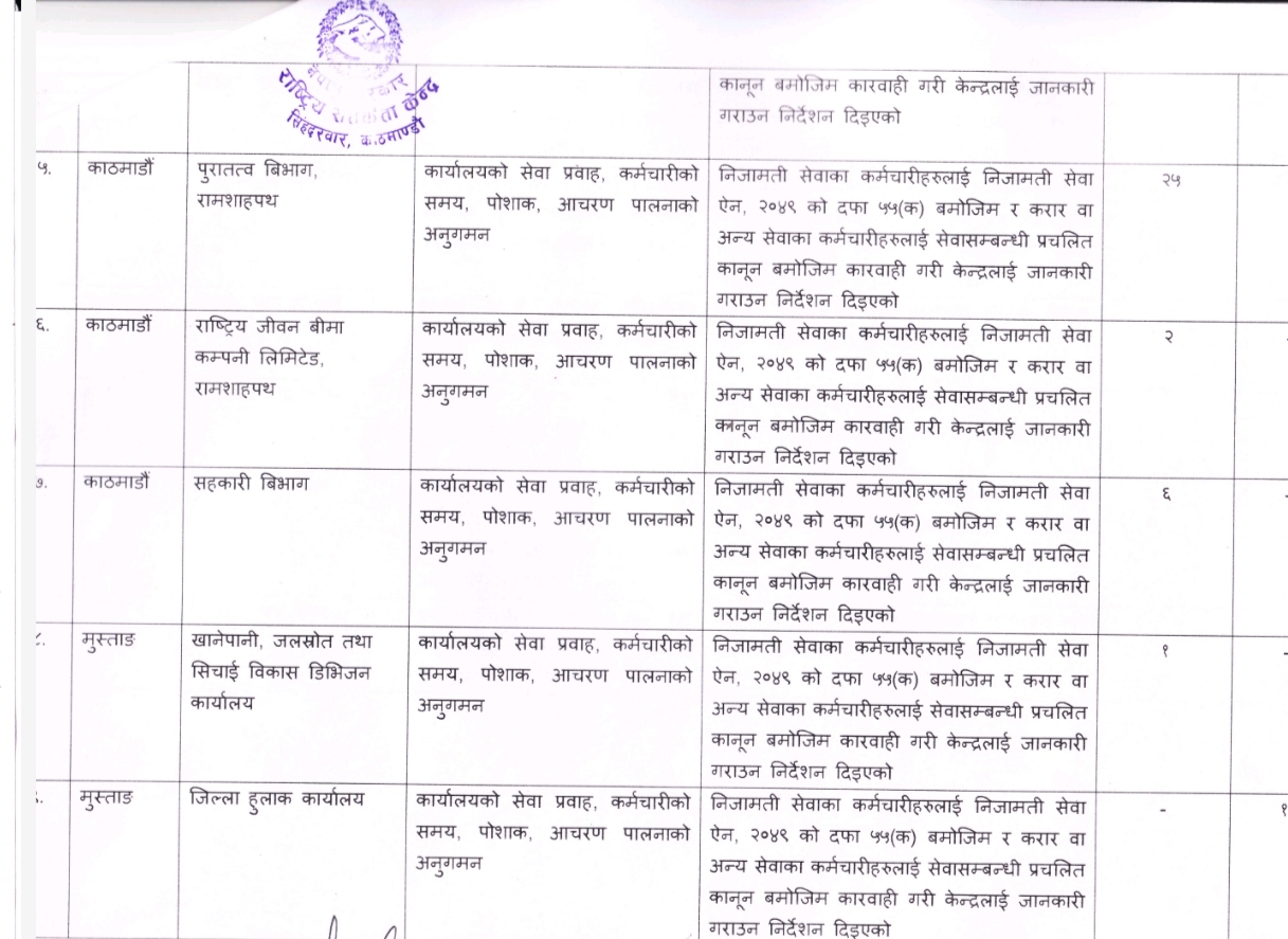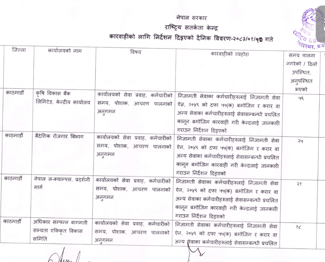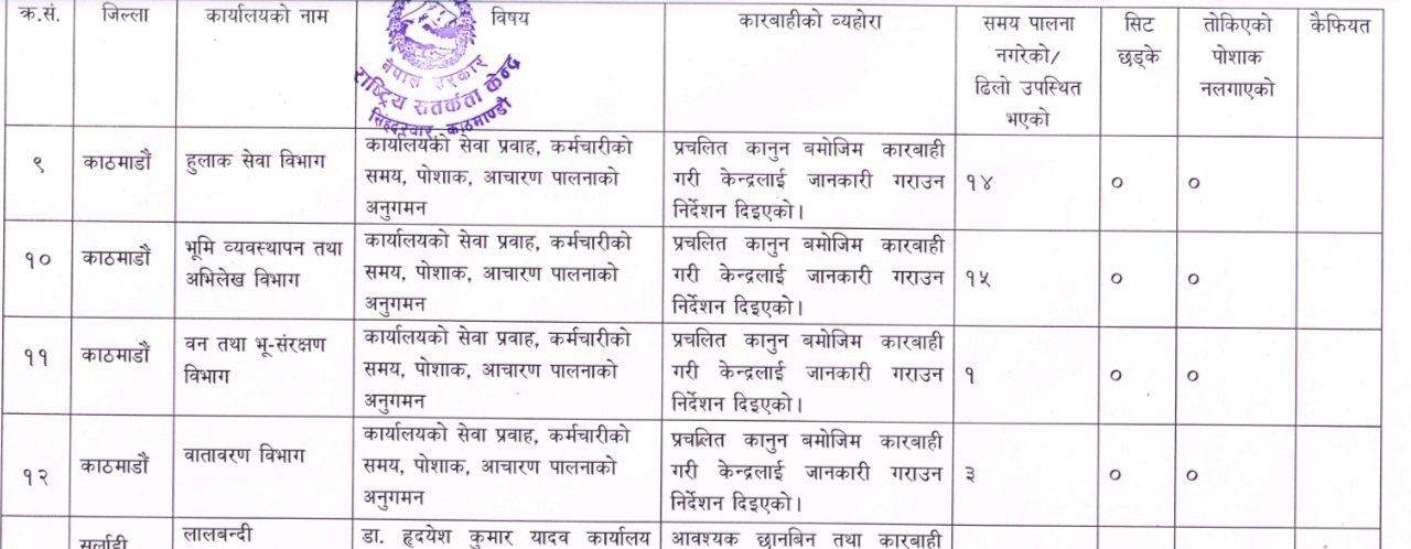 कृषि विकास बैंक लिमिटेडको केन्द्रीय कार्यलयमा ५९ जना, पुरातत्त्व विभागका २५ जना, नेपाल ल क्याम्पसमा २१ जना, नेपाल कमर्स क्याम्पसका १७ जना र अधिकार सम्पन्न बागमती सभ्यता एकीकृत विकास समितिका १८ जना, भूमि व्यवस्थापन तथा अभिलेख विभागमा १५ जना र हुलाक सेवा विभागमा १४ जना कर्मचारीले समय पालना नगरेको फेला परेको छ। केन्द्रको छड्केमा सहरी विकास तथा भवन निर्माण विभागका १६ जना, सहकारी विभागका ६ जना, वातावरण विभागमा ३ जना, युवा साना व्यवसायी स्वरोजगार कोषका ५ जना, राष्ट्रिय खेलकुद परिषद्का ४ जना र नेपाल टेलिकमका ३ जना कर्मचारीले समय पालना नगरेको फेला परेको हो।