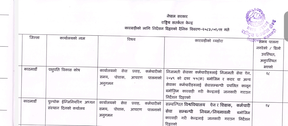 केन्द्रले गरेको छड्केमा कोषका १८ जना कर्मचारी कार्यालय समयमै उपस्थिति नभएको पाइएको हो। पशुपति क्षेत्र विकास कोषको काम कारबाहीको विषयमा विभिन्न टिकाटिप्पणी भइरहँदा केन्द्रले छड्के हानेको थियो। केन्द्रको छड्केमा ठूलो संख्यामा कामचोर कर्मचारी फेला परेका हुन्।