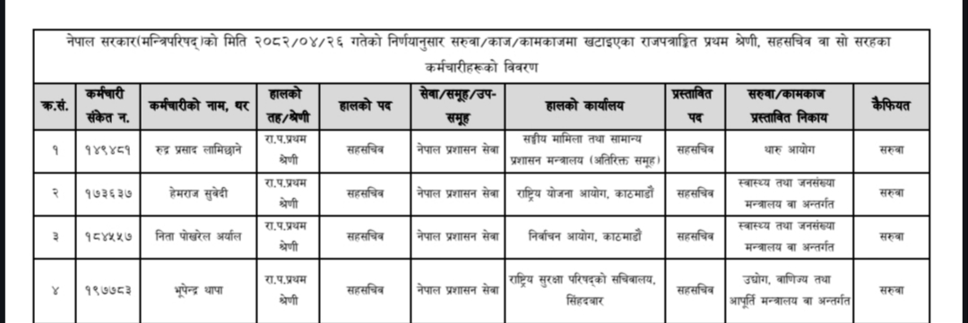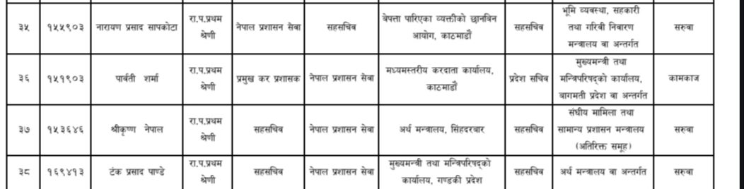 २०८३ भदौं १३ गते बसेको मन्त्रिपरिषद्को बैठकले पार्वती र नितालाई संघीय मामिला तथा सामान्य प्रशासन मन्त्रालयमा सरूवा गऱ्यो। कारण थियो एमालेबाट सामान्य प्रशासन मन्त्री बनेकी भगवती न्यौपाने। तत्कालीन अवस्थामा राष्ट्रिय सभा सदस्य रहेकी न्यौपाने केपी शर्मा ओलीको विश्वास जितेर संघीय मामिला तथा सामान्य प्रशासनमन्त्री बनेकी थिइन्। राष्ट्रियसभाको ६ वर्षे कार्यकाल सकिन ६ महिना मात्रै बाँकी छँदा तत्कालीन प्रधानमन्त्री ओलीले न्यौपानेलाई सामान्य प्रशासनमन्त्री बनाएका थिए। भगवती सामान्य प्रशासनमन्त्री भएलगत्तै एमाले निकट रहेका पार्वती र निता सरूवा बदर गर्दै सामन्य प्रशासन मन्त्रालय पुगेका थिए। भगवतीले पार्वतीलाई प्रशासन महाशाखा प्रमुख र नितालाई आन्तरिक व्यवस्थापन महाशाखा प्रमुखको जिम्मेवारी दिएकी थिइन्।