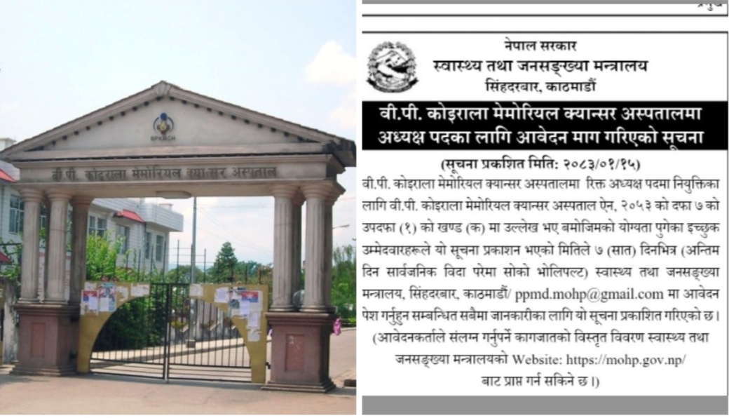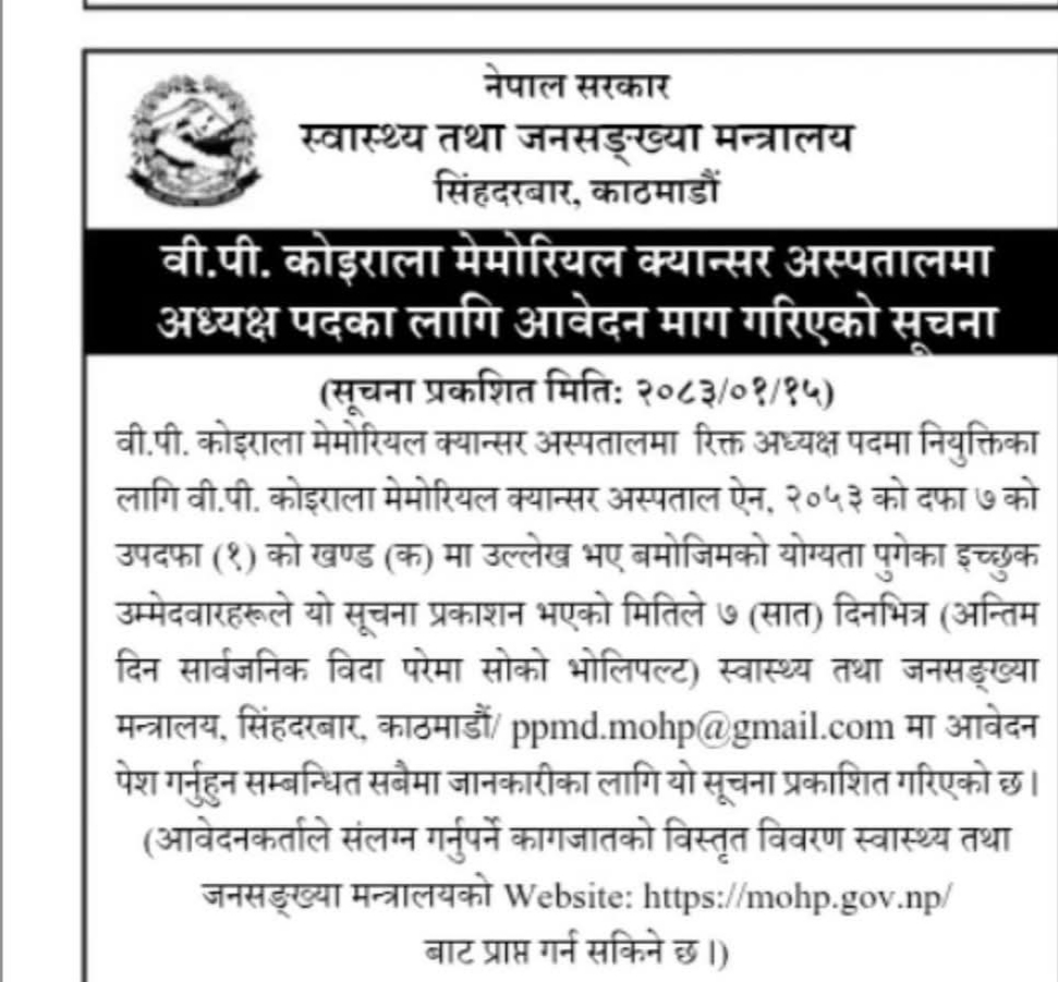 स्वास्थ्य तथा जनसंख्या मन्त्रालयले वीपी कोइराला मेमोरियल क्यान्सर अस्पतालको अध्यक्ष पदमा खुला प्रतिस्पर्धाबाट नियुक्ति गर्न आवेदन मागेको छ। मंगलबार ७ दिनको म्याद दिएर आवेदन मागेको हो। वीपी कोइराला मेमोरियल क्यान्सर अस्पताल ऐन, २०५३ को दफा ७ को उपदफा (१) को खण्ड (क) मा उल्लेख भए बमोजिमको योग्यता पुगेका इच्छुक उम्मेदवारले आवेदन दिन सक्ने स्वास्थ्य मन्त्रालयले जनाएको छ।