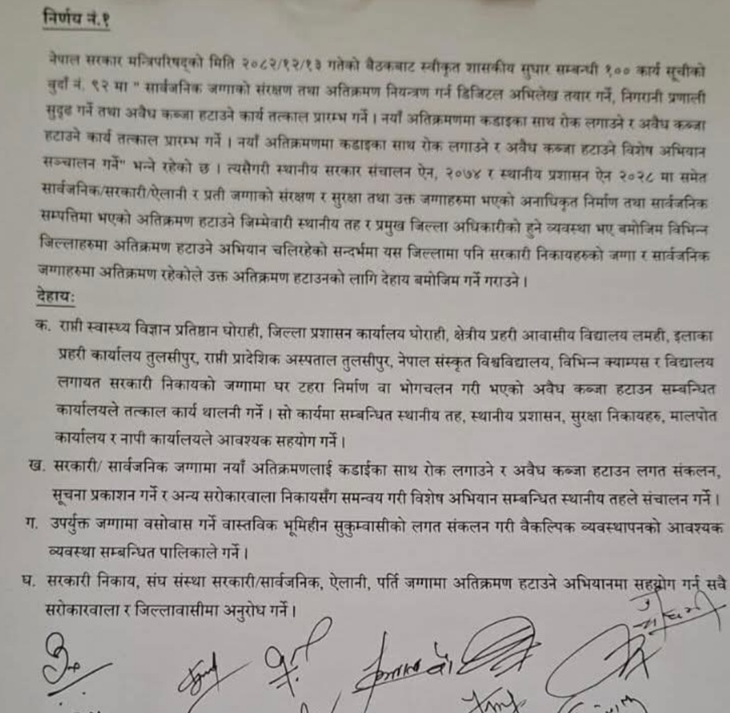 घोराहीमा रहेको राप्ती स्वास्थ्य विज्ञान प्रतिष्ठान, जिल्ला प्रशासन कार्यालय, राप्ती प्रादेशिक अस्पताल तुलसीपुर, क्षेत्रीय प्रहरी आवासीय विद्यालय, लमही, इलाका प्रहरी कार्यालय तुलसीपुर, नेपाल संस्कृत विश्वविद्यालय, विभिन्न क्याम्पस र विद्यालय, लगायत सरकारी जग्गामा घर टहरा निर्माण वा भोगचलन गरी भएको अवैध कब्जा हटाउन सम्बन्धित कार्यालयले तत्काल कार्य थालनी गर्ने। सो कार्य सम्बन्धित स्थानीय तह, स्थानीय प्रशासन, सुरक्षा निकायहरू, मालपोत कार्यालय, नापी कार्यालयले आवश्यक सहयोग गर्ने निर्णय गरेको छ।राप्ती स्वास्थ्य विज्ञान प्रतिष्ठान, जिल्ला प्रशासन कार्यालय, राप्ती प्रादेशिक अस्पताल तुलसीपुर, क्षेत्रीय प्रहरी आवासीय विद्यालय, लमही, इलाका प्रहरी कार्यालय तुलसीपुर, नेपाल संस्कृत विश्वविद्यालय, विभिन्न क्याम्पस र विद्यालय, लगायत सरकारी जग्गामा घर टहरा निर्माण वा भोगचलन गरी भएको अवैध कब्जा हटाउन सम्बन्धित कार्यालयले तत्काल कार्य थालनी गर्ने। सो कार्य सम्बन्धित स्थानीय तह, स्थानीय प्रशासन, सुरक्षा निकायहरू, मालपोत कार्यालय, नापी कार्यालयले आवश्यक सहयोग गर्ने निर्णय गरेको छ।