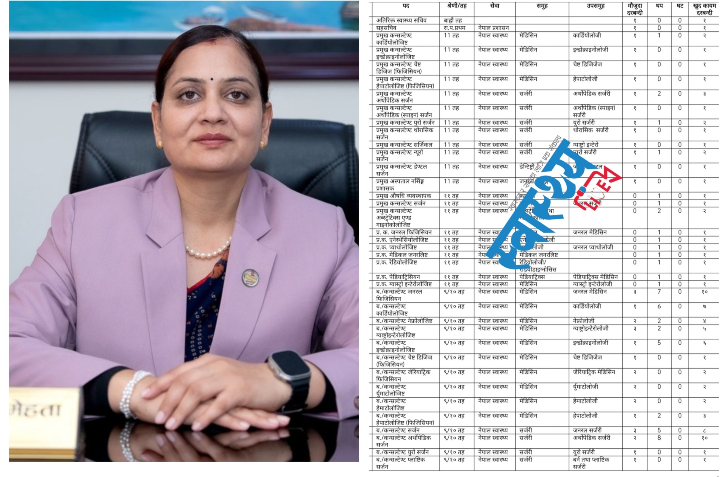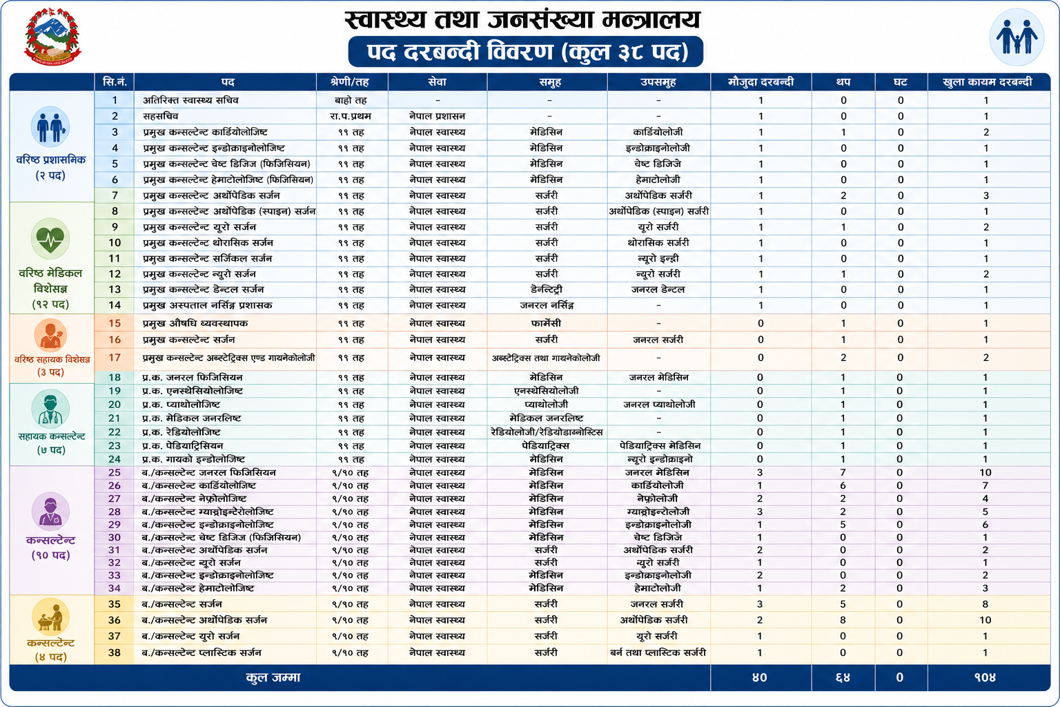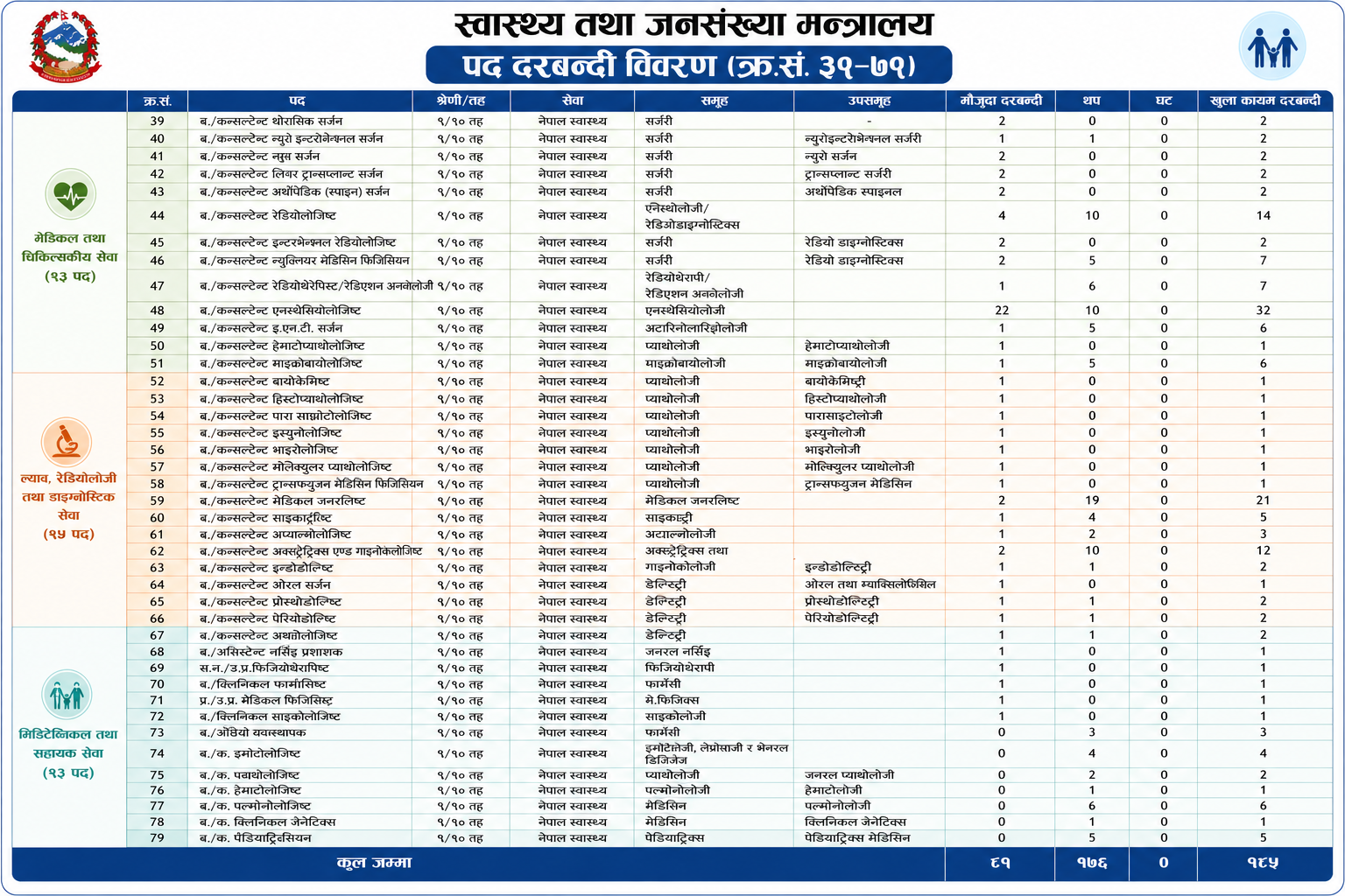 सबैभन्दा बढी माग हुने स्टाफ नर्सको संख्या १०६३ पुर्याइएको छ भने मेडिकल अधिकृत १८२ जना थप गरिएको छ। एनेस्थेसियोलोजिस्टलगायत अन्य विशेषज्ञ दरबन्दी पनि उल्लेख्य रूपमा विस्तार गरिएको छ।